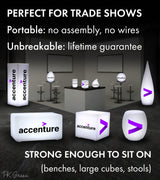 Many of our clients use our branded items for trade shows, conventions and expos. Many of our larger items are strong enough to sit on.